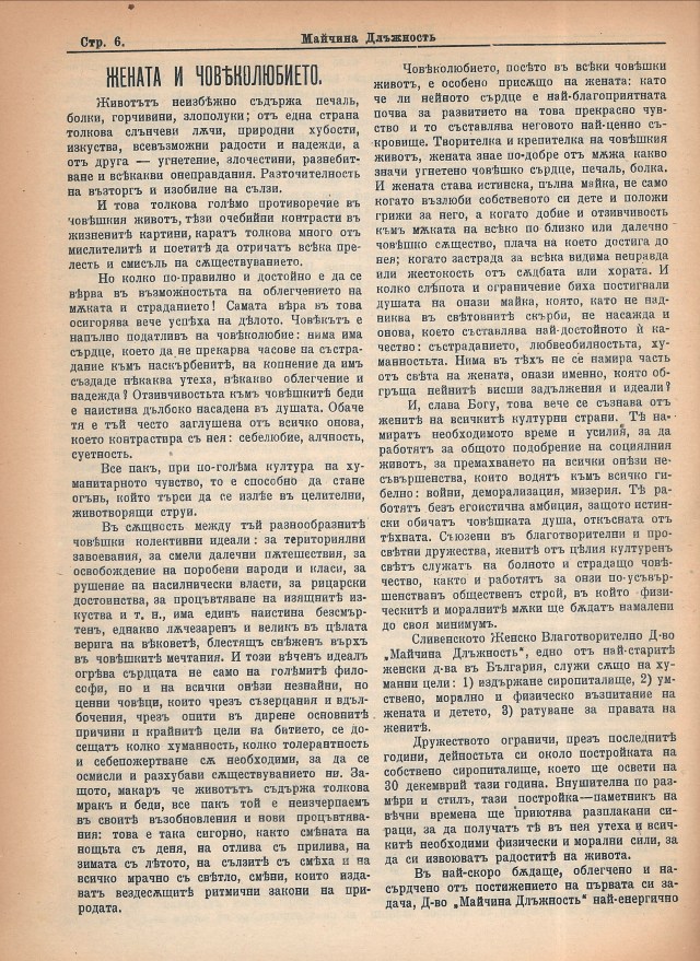 Вместо заключение ви предлагаме да се насладим на великолепната ѝ статия „Жената и човеколюбието“.